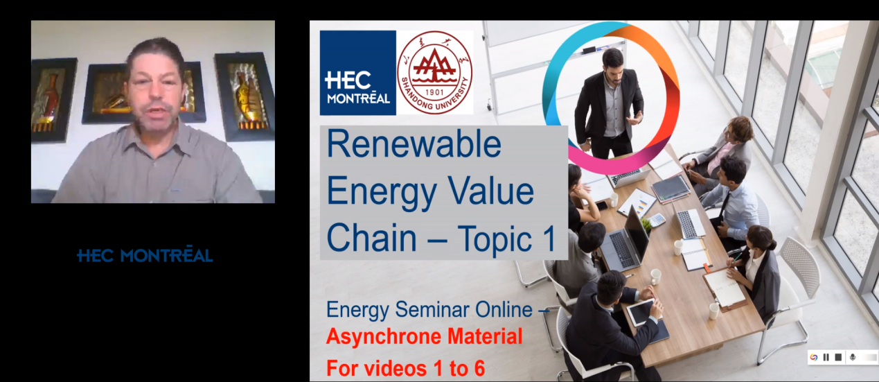 的Sylvain Audette教授以“可再生能源价值链”为核心,在能源链的发展和趋势、全球能源问题以及中国的碳排放与交易系统等方面与同学们进行了线上分享和交流。