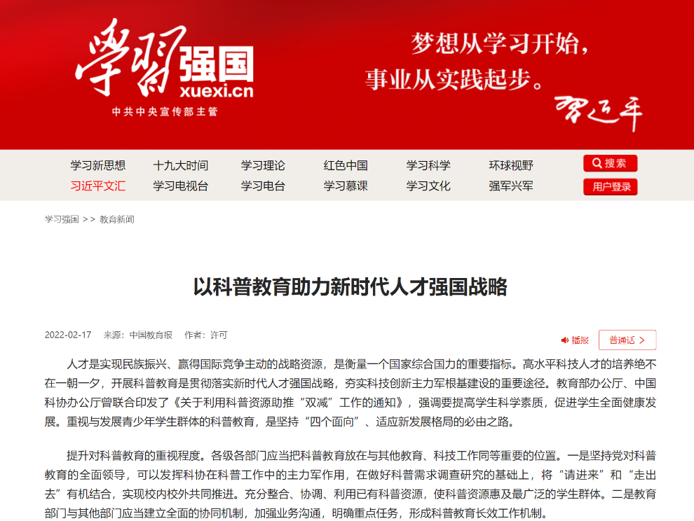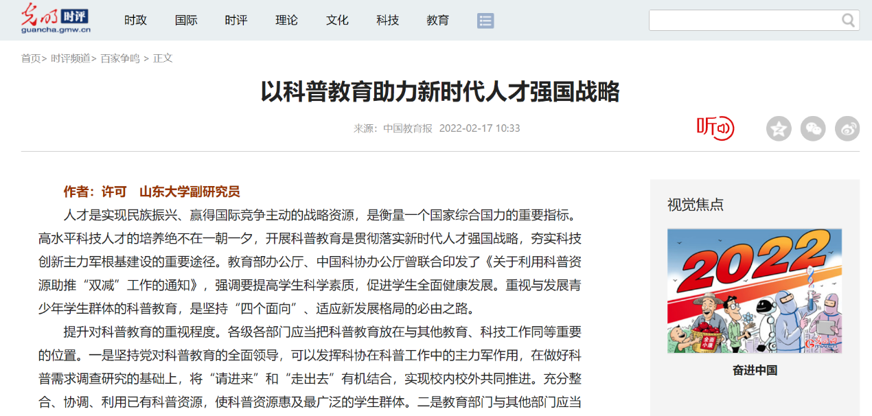 教师许可副研究员在《中国教育报》第2版刊发文章《以科普教育助力新时代人才强国战略》,并在中国教育新闻网上同步刊载。文章认为:重视与发展青少年学生群体的科普教育,是坚持“四个面向”、适应新发展格局的必由之路。应当提升对科普教育的重视程度;关注科普教育的动态性与变革性;健全科普课程教师培养机制,努力实现科普教育与科普教师专业化;推动科普教育资源均衡发展,努力实现科普教育层面的“共同富裕”;弘扬尊重科学、尊重科学人才的社会正能量。