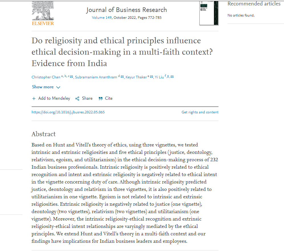 刘怡副教授作为通讯作者的学术论文《Do religiosity and ethical principles influence ethical decision-making in a multi-faith context? Evidence from India》,在商学领域国际重要期刊《Journal of Business Research》2022年第149卷发表。
