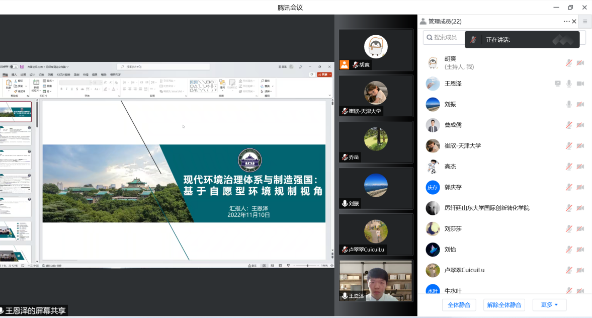 王恩泽博士以“自愿型环境规制如何影响中国制造业企业成本加成?——基于ISO14001环境管理体系认证的经验证据”为题作了学术报告。报告基于资源基础观理论,以企业参与ISO14001环境管理体系认证(ISO14001认证)为切入点,借助自行爬取的微观层面ISO14001认证数据、中国税收调查数据、企业层面的专利申请数量数据与环境调查与报告数据库匹配构成的2007—2016年面板数据,综合运用倾向得分匹配法与双重差分法研究了自愿型环境规制对制造业企业竞争力的影响。