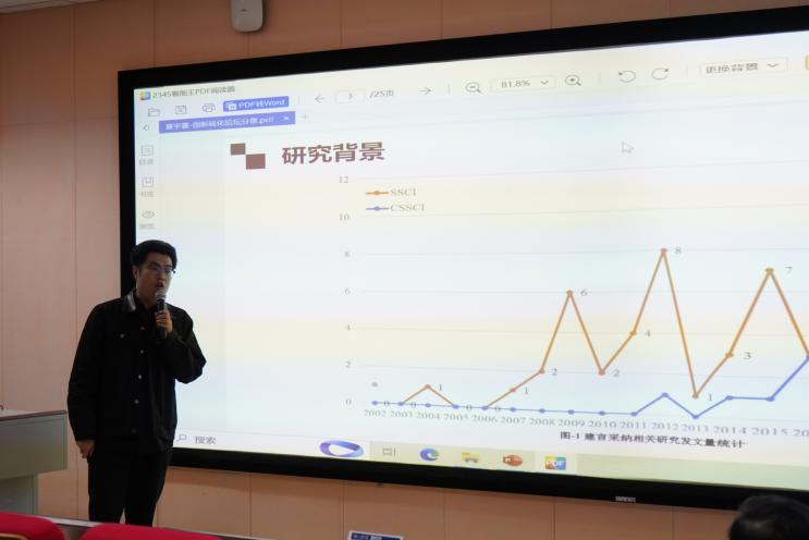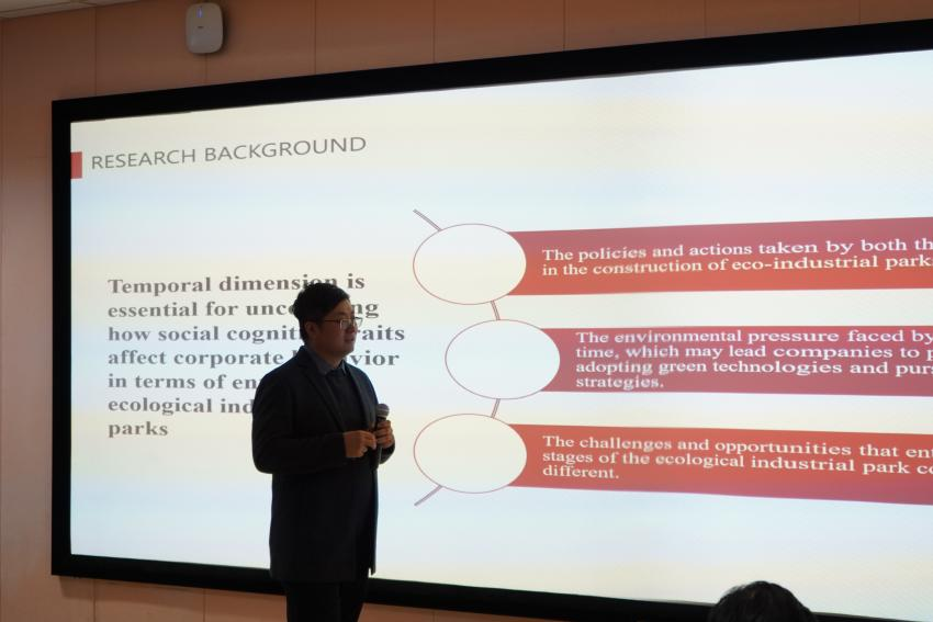 助理研究员赵云做了《创业者时间倾向性对绿色创新采纳的影响研究》,以企业迁入生态产业园行为为研究对象,从创业者社会认知与时间倾向性角度,分析了企业家个人特征对制造业企业迁入园区的影响,结果显示企业家自我效能感与风险承担显著促进企业迁入园区,而企业家时间急迫感能够加强这个效应的实现。