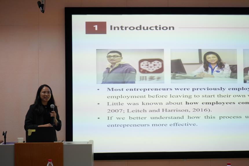 助理研究员刘莎莎做了《创业者身份同化过程:身份游戏机制》,探讨了员工如何自愿成为创业者,构建了创业者身份同化的过程模型,并说明了其中可能自我的动态推拉平衡作用以及身份游戏的迭代机制,打开了身份过程理论的同化黑箱。
