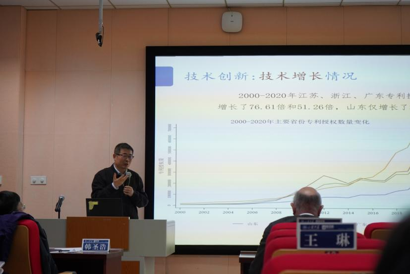 副院长郑江淮做了《城市技术邻近性与区域创新集群发展--山东现象与长三角、广州对比分析》,介绍了新旧动能转换与高质量发展背景下,全国各省创新驱动发展格局。对比了山东与长三角、广东省高技术产业的发展及区域研发投入状况,及各省内部技术邻近性变化。深度剖析了山东与其他省份、主要城市之间的技术邻近性变化。