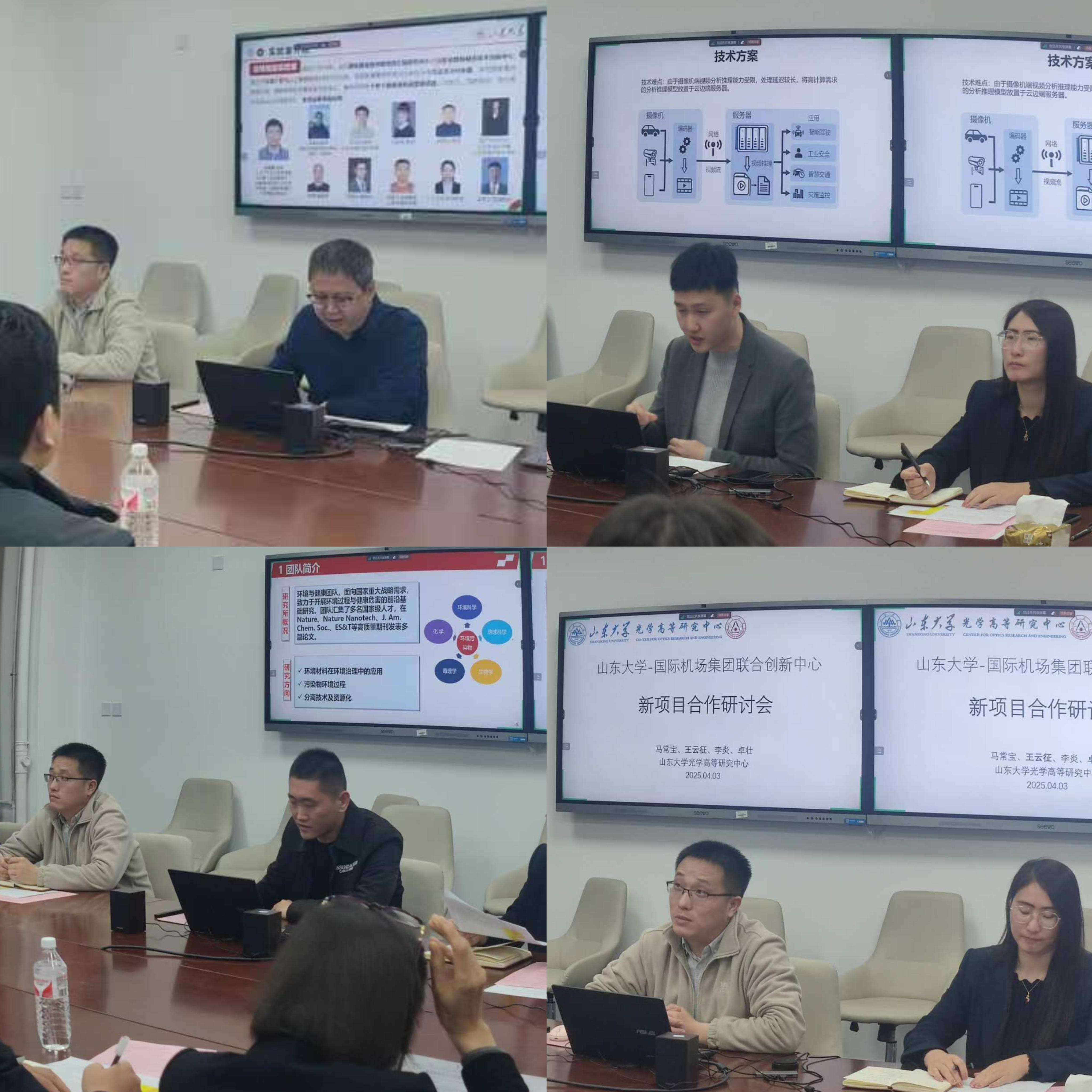 、光学高等研究中心的三个科研专家团队,围绕青岛机场集团各部门提出的多个技术需求,分别进行了深入的方案讲解,并与相关部门技术专家展开现场交流。张广辉教授、郑艳伟副研究员围绕飞行区管理部与航空安保部提出的“机场跑道异物探测系统视频分析AI应用”、“违反安全作业行为识别和预警”、“复检系统+AI智能识图在民航安检工作中的应用”、“高精度时空定位系统”等四项需求,分别给出了解决思路。张海光副研究员则就飞行区管理部提出的“机坪除冰及除冰液高效回收”问题进行了详尽的技术回应。最后,王云征研究员针对“光纤传感网络用于机场跑道实时应力监测”、“机场跑道激光除冰”等两项需求,提出了具体的解决方案与优化建议。