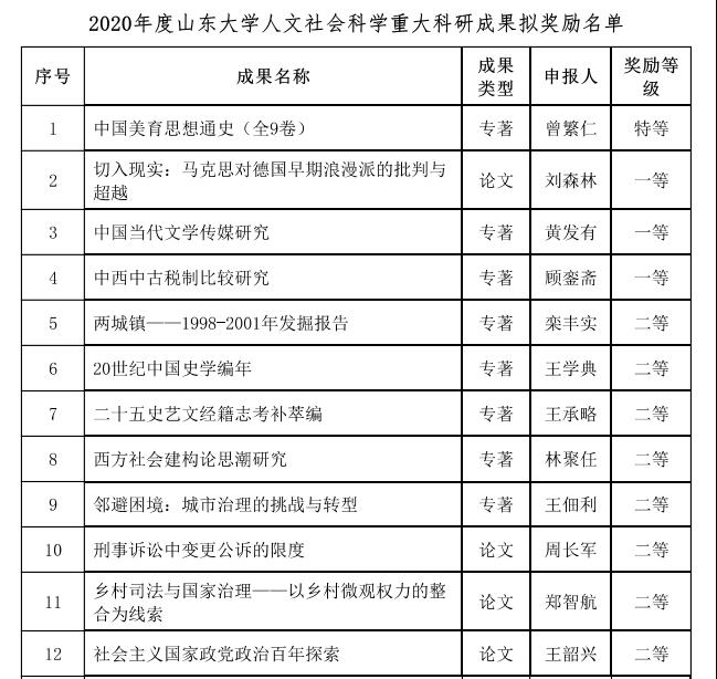根据《山东大学人文社会科学重大科研成果奖励办法》(山大科字〔2021〕1号)和“关于申报2020年度山东大学人文社会科学重大科研成果的通知”,经个人申报、单位审核推荐、资格审核、专家组评审等环节,确定36项成果为2020年度山东大学人文社会科学重大科研成果拟奖励成果。spbo1即时比分足球比分