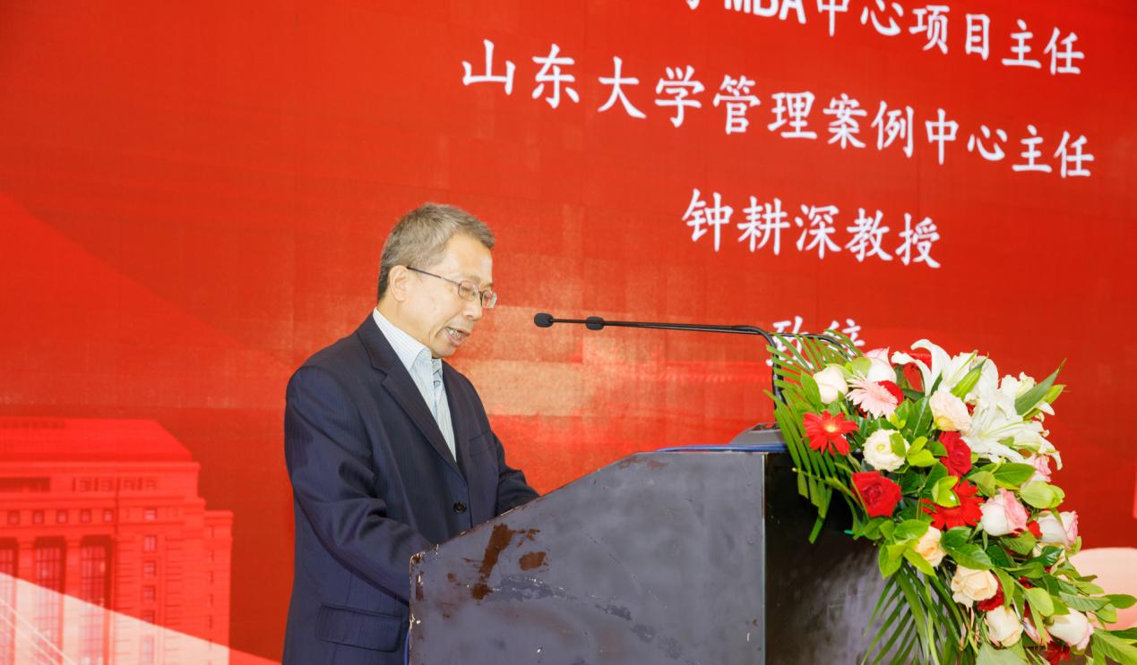 钟耕深作为教师代表发言,分享了山东大学在学术、经济及科技领域的瞩目成就,学校与诸多名企的战略合作关系,在此支持下,同学们可以便捷地汲取学术营养,开阔视野,拓展思维,为创新创业发现新的资源、新的思路,鼓励同学们为商界领袖与管理精英储备必要的理论、方法、思维和能力。