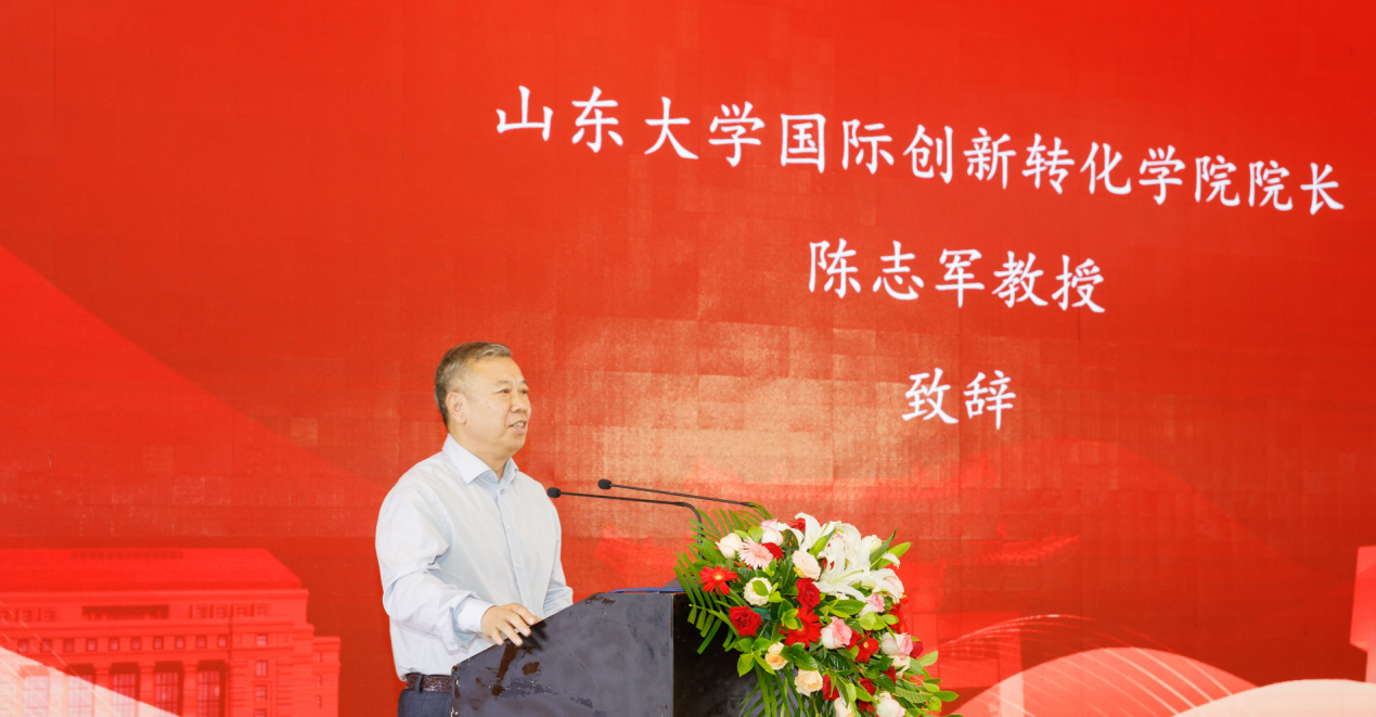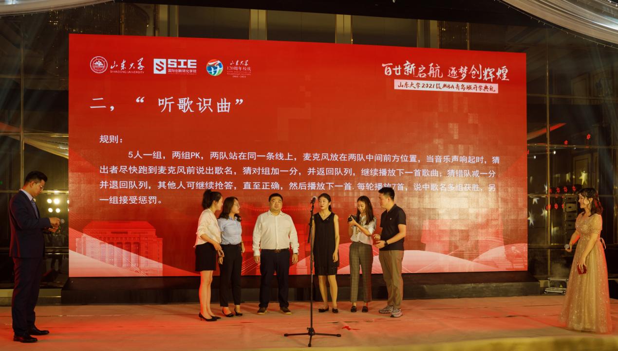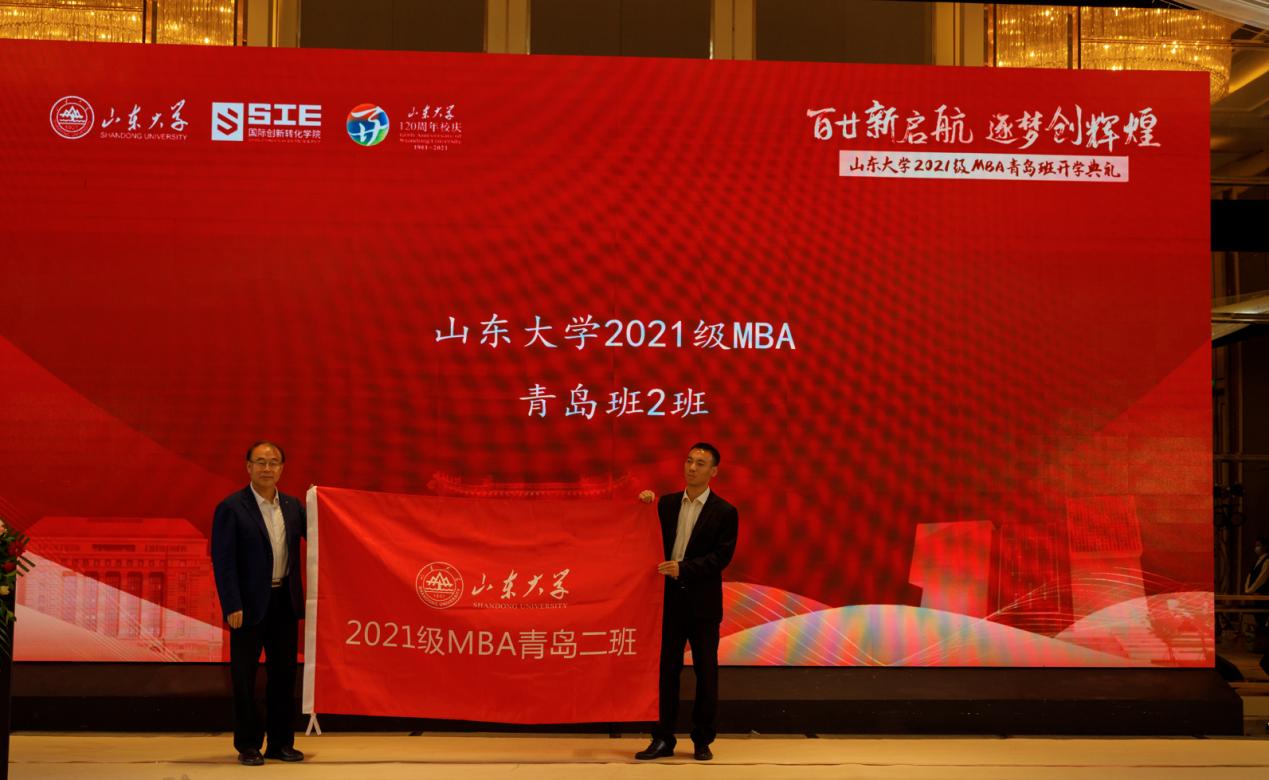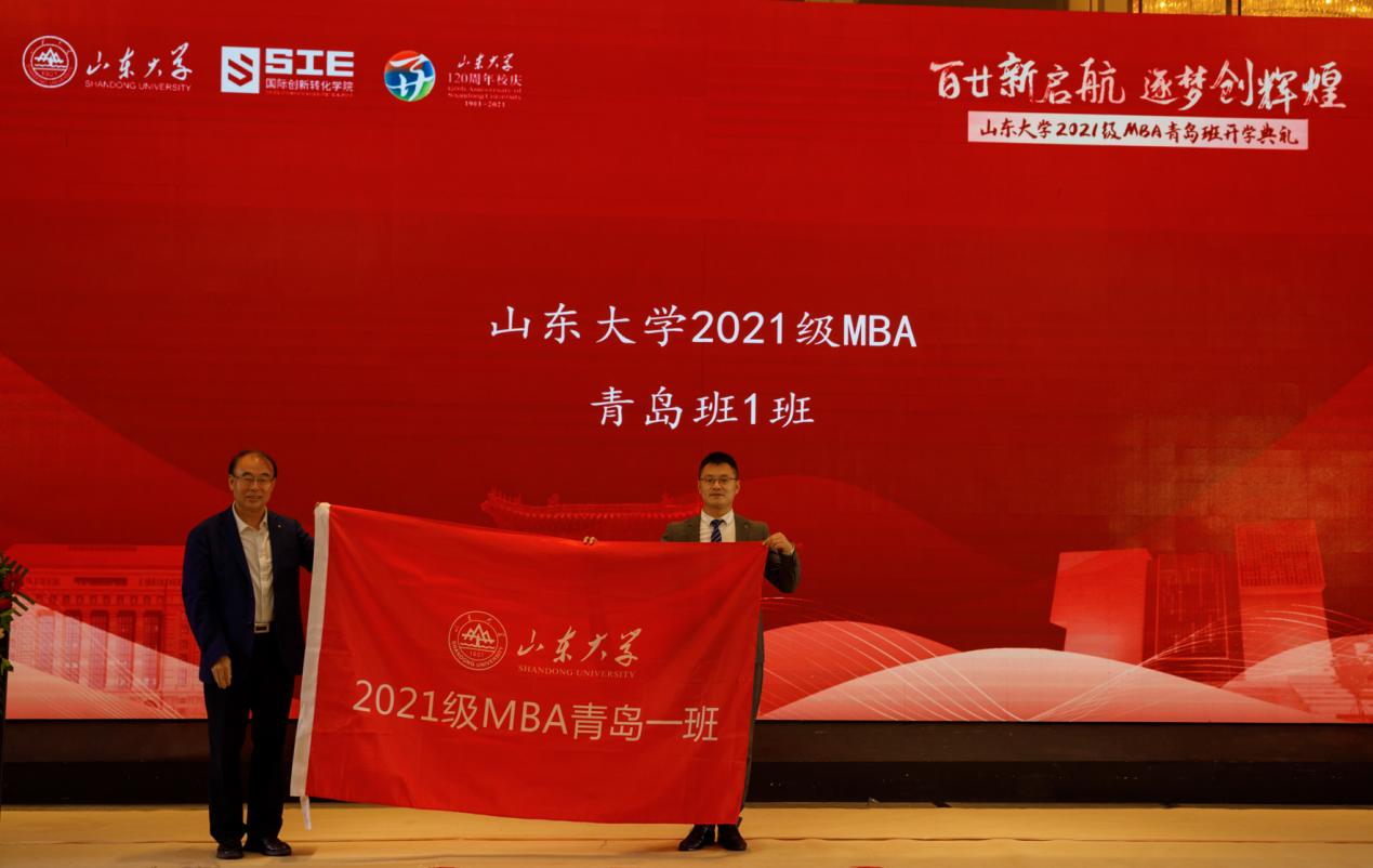 院长陈志军教授分别致辞,并为2021级MBA青岛1班、2班授予班旗。2020级MBA青岛班优秀学员代表于松,2021级MBA青岛班学员代表赵丽、高波分别发言。山东大学(青岛)MBA中心主任陈卓主持典礼。