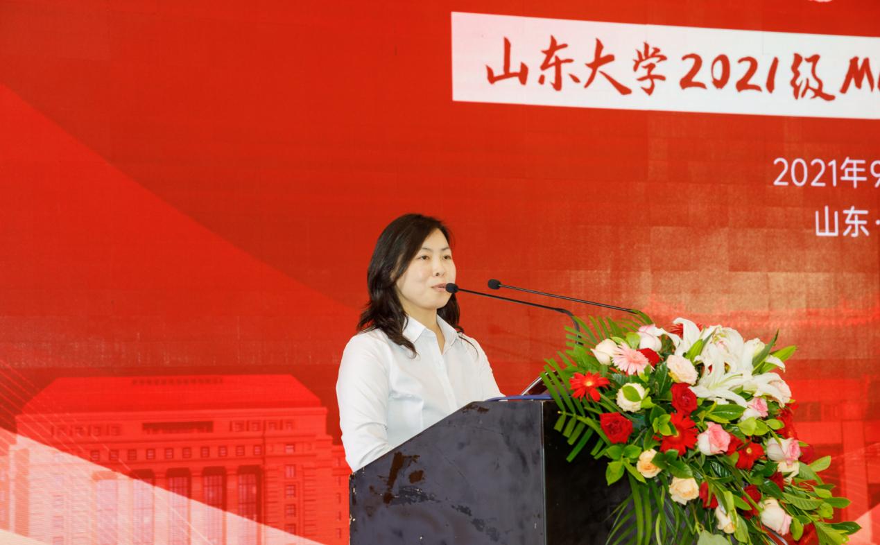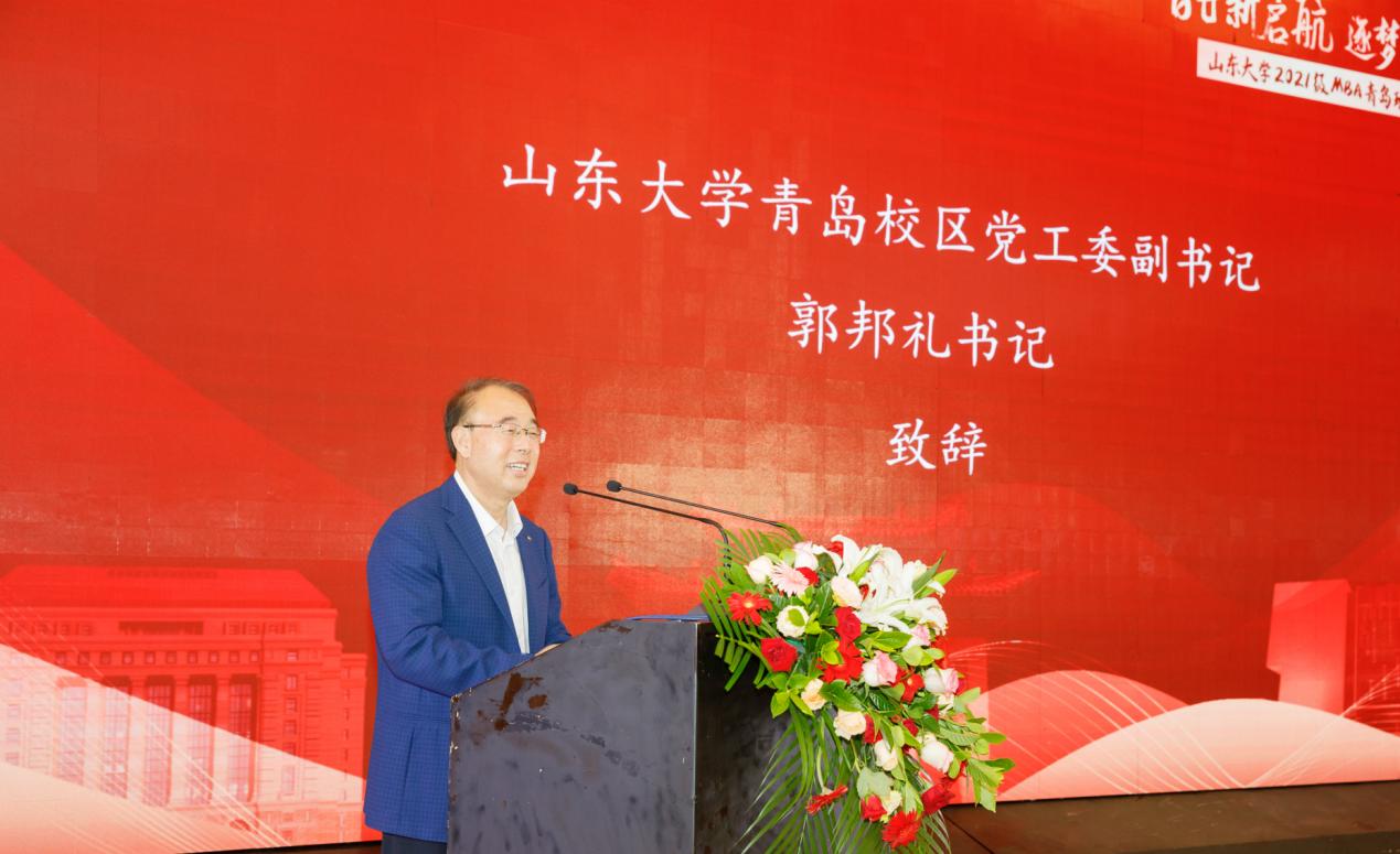 郭邦礼代表校区向2021级MBA新同学的到来表示热烈的欢迎,他分别列举了山大历史上的优秀校友、各个优势学科和社会贡献,分享了山东大学在百廿光阴中的深厚积淀和对国际和民族的担当,勉励同学们弘扬山大文化,传承“山大基因”,以社会主义建设者和接班人的使命担当,立大志、明大德、成大才、担大任,与祖国同心、与世界同行、与时代同频,早日成为担当民族复兴大任的时代新人。