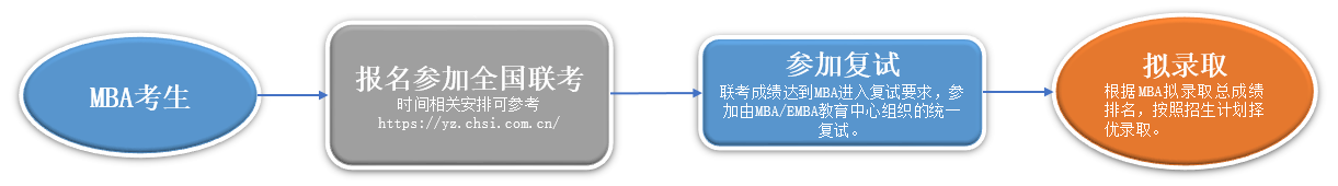 (二)报考流程:考生登录中国研究生招生信息网,填写报名山东大学MBA→联考成绩达到我校MBA复试要求,参加MBA/EMBA教育中心组织的统一复试→根据MBA拟录取总成绩排名按照招生计划择优录取。
