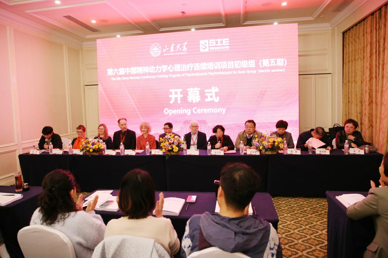 副院长乔岳教授等出席开幕式。开幕式由中挪初级组项目负责人山东大学吴少怡教授主持。四位来自北欧的心理学专家Camilla Halvarson、Alexandra Billinghurst、Ulf Lindbarg、Hanne-sofie Johnsen Dahl,三位来自国内的心理学专家杨丽、赵丞智、刘红,以及110余位来自全国21省市自治区的心理治疗师共同参加了开幕式。