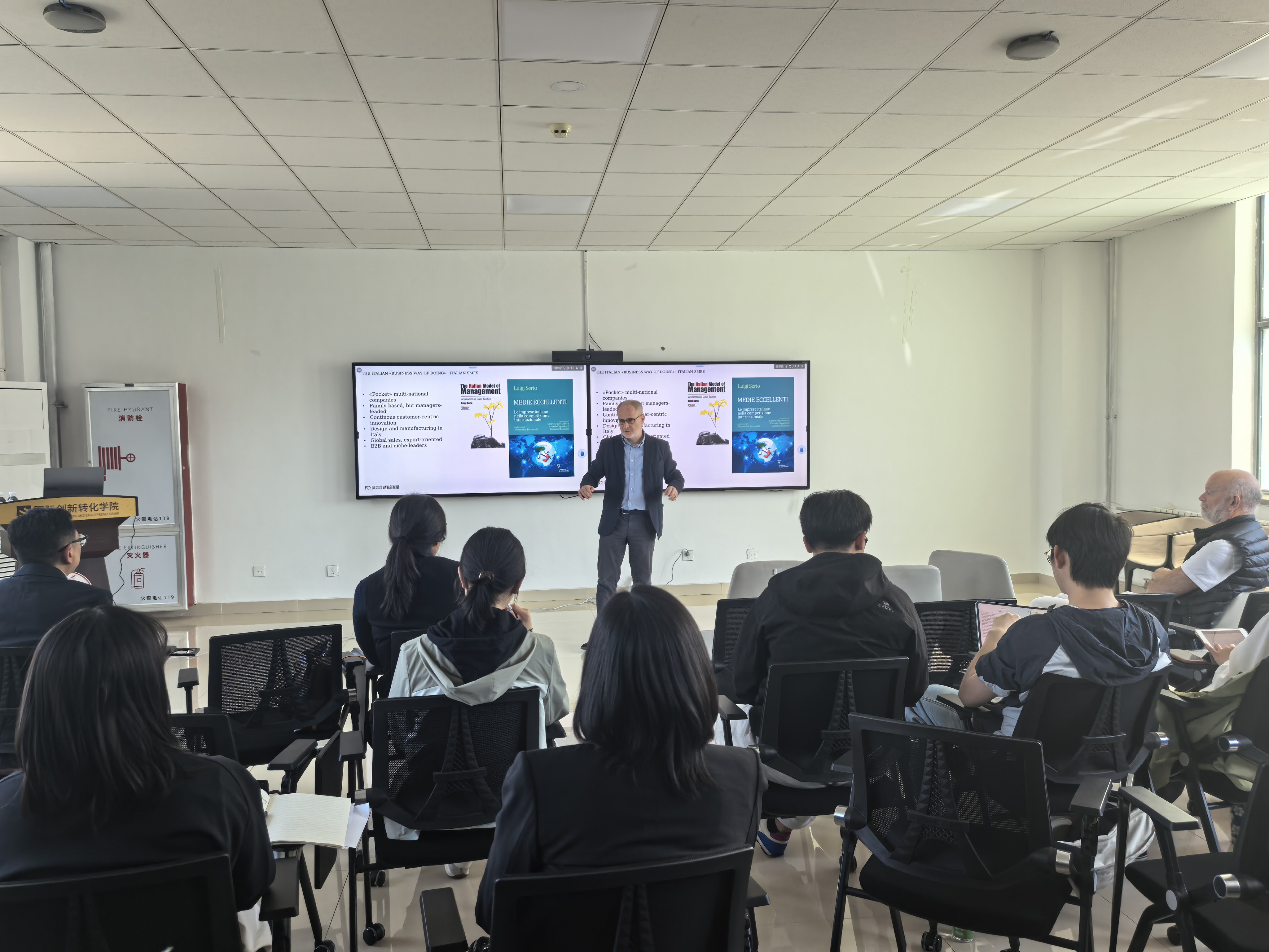 讲座还聚焦意大利国家发展现状与产业特点。意大利人文底蕴深厚,拥有全球领先的世界非遗遗产,经济发展呈南北差异,北部米兰等地经济富庶,是创新创业的核心聚集地。其经济结构特色鲜明,九成以上为小微企业,超六成为家族式经营。依托高端制造、自动化、轻奢奢侈品、高端家居“四大产业支柱”及独特的产业集群模式,众多小微企业协同竞争,催生了法拉利、古驰等世界级品牌。意大利以设计驱动创新,专注小众高端精细化制造,凭借独特设计与精良品质领跑全球高端市场。